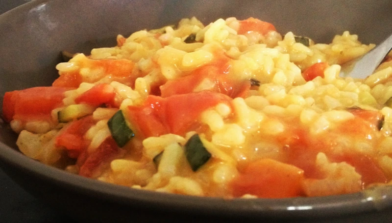 Incorporer ensuite le reste du bouillon, les tomates et le thym. Laisser un peu s'évaporer et à la fin de cuisson mettre le beurre et les courgettes. Il faut que le risotto soit crémeux ! Rectifier l'assaisonnement et ajouter le parmesan. Servir chaud !