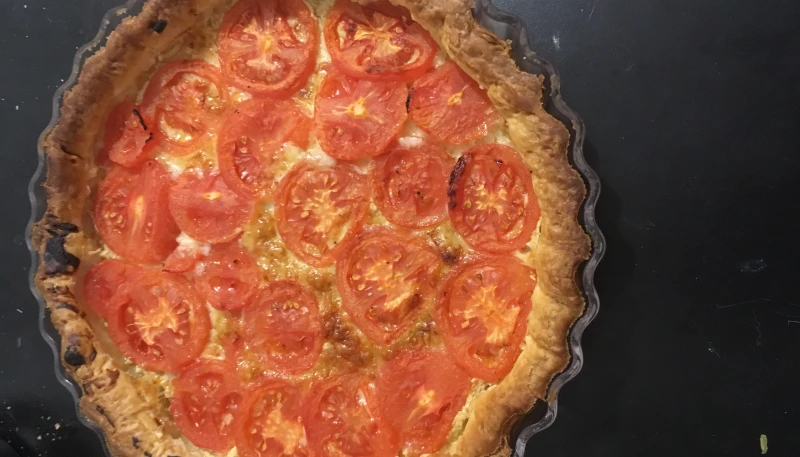 Une fois la pâte pré-cuite, étaler la moutarde sur le fond, ajouter le fromage râpé et finir avec les rondelles de tomates.