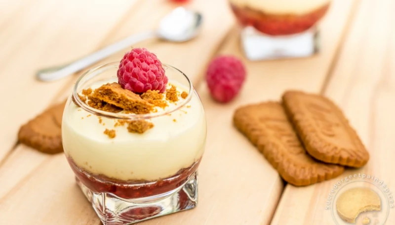 Puis dans une verrine, mettre en premier les spéculos, puis le mascarpone et enfin recouvrit le tout de coulis de framboise.