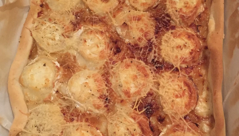 4° Ajouter la préparation sur la crème puis déposer les rondelles de chèvre. Parsemer la tarte de poivre puis de gruyère râpé.