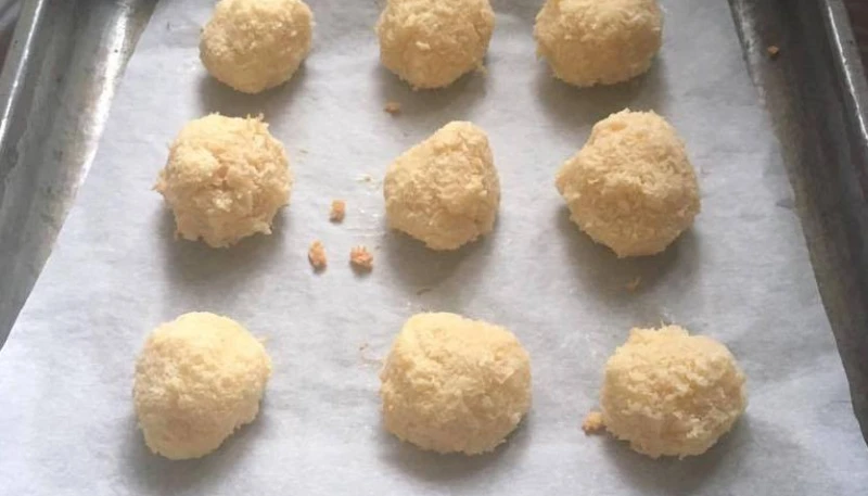 Former des petites " boulettes" et disposer les sur une plaque recouverte de papier de cuisson. Faire cuire 45 minutes à 120°C.
