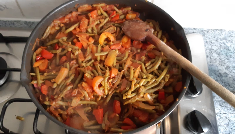 4° Incorporez les haricots verts avec le poivron et les oignons frits.