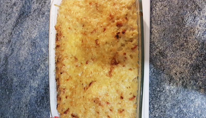 - Quand vos pâtes sont prêtes, mettez les dans le plat à four. Rajoutez vos lardons. Mélanger le tout. Puis rajoutez par dessus du gruyère râpé et du parmesan.
