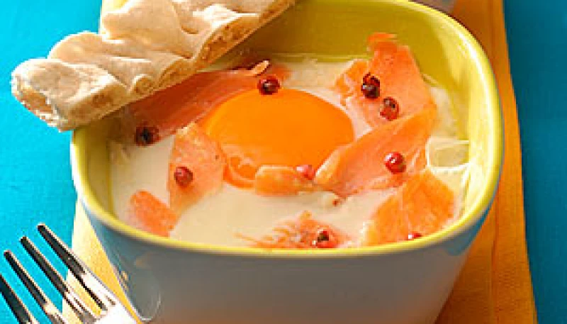 • Faites chauffer doucement la crème dans une petite casserole. Retirez-la du feu et versez-en 1 cuillerée à soupe dans chaque ramequin. Répartissez les cubes de saumon dans les ramequins, puis cassez un oeuf dessus. Salez et poivrez légèrement. Répartissez le reste de la crème à la surface.