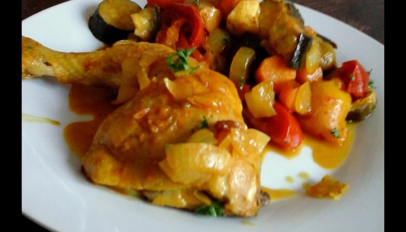 La veille, préparez la marinade avec l’huile d’olive, le paprika doux, le curcuma, le piment, le sel et le poivre. Faites mariner le poulet toute la nuit.