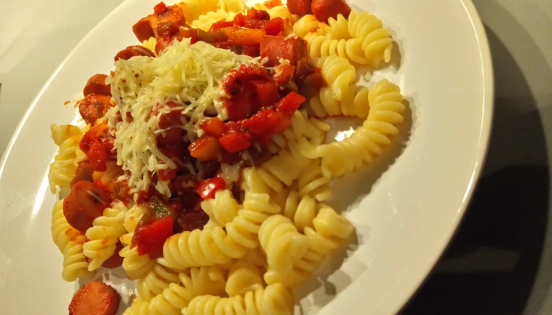 2. Coupés les saucisses en morceaux et les faire cuire 3min dans la poële, en y ajoutant le sel, le poivres, le parika, le persil et le thym, les poivrons hâchés puis la sauce tomate. Laissez cuire quelques minutes ( 5 à 10 min environ ).