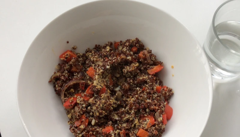 3- Lorsque le quinoa est cuit, égouttez-le et ajoutez le au poivron et à l'oignon rouge dans la poêle. Mélangez bien, ajoutez un peu de pâte de curry rouge si vous en avez et si vous voulez relever un peu la préparation (ceci est facultatif), salez et poivrez. Couvrez et laissez mijoter 2 à 3 minutes.