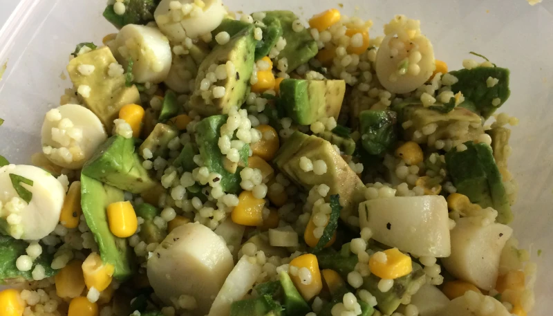2- Coupes votre avocat en petits cubes et vos cœurs de palmiers en rondelles; mélangez-les au maïs égoutté et aux perles de blé.