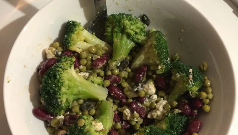 3- Une fois le brocolis cuit, coupez le et ajoutez le aux légumes; agrémentez de graines de courge, salez, poivrez et ajoutez une cuillère d'huile d'olive et un peu de vinaigre balsamique.