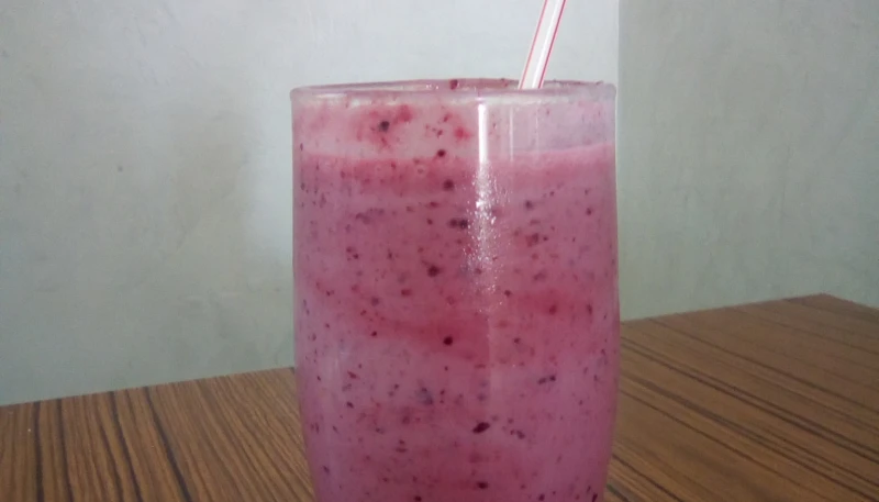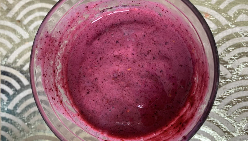 Mettre un verre de fruits rouges dans le blender, ajouter le verre de lait et les 2 cuillères à soupe de sucre de canne.