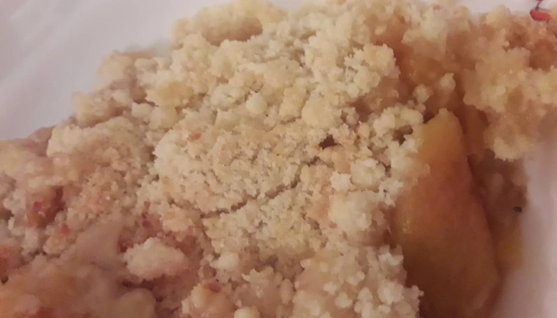 Émietter ce sable sur les pêches (un centimètre d'épaisseur) puis mettre les amandes.