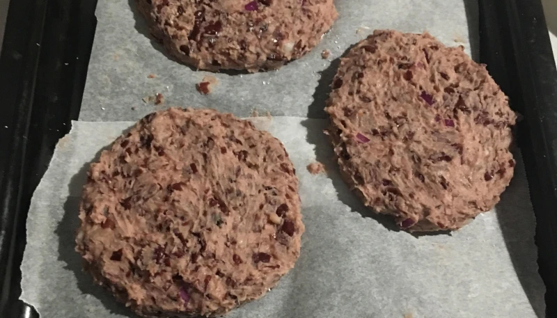 5. Disposer du papier cuisson sur une plaque. Former des steaks (à la main ou avec des emporte-pièces) et les déposer sur la plaque. Enfourner.