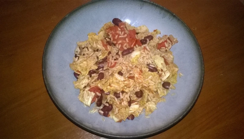 - Quand ils commencent à brunir, rajouter le chou, les haricots, la boîte de tomates, la sauce soja et les épices.