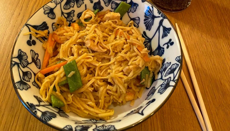5. Dans la poêle, ajouter le poulet et les nouilles. Remettre un peu d'huile si besoin. Mettre sur feu fort, et ajouter la sauce soja sucrée (ou de la sauce soja classique mélangée à du miel) ainsi qu'un peu de gingembre en poudre. Saler et poivrer au goût, et servir.
