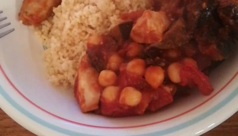 Vos pois chiches doivent être prêt maintenant ^-^. Égouttez-les et mélangez-les avec le reste dans la poêle. Laissez encore 2-3 minutes sur le feu.