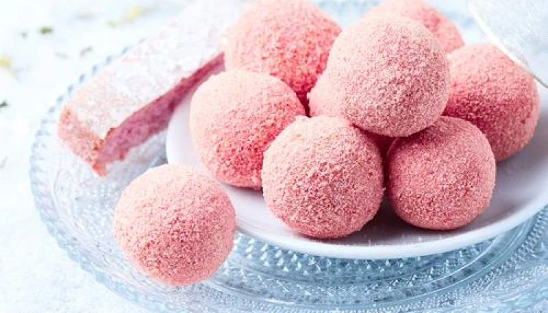 Roulez la petite boule sur la poudre restante de biscuit rose pour les enrober.