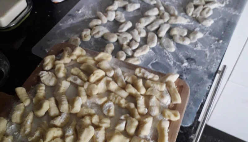 Formez ensuite des petits saucissons avec la pâte (4 saucissons d'un diamètre de 1cm à peu près) et couper des petits morceaux pour former les gnocchis.
