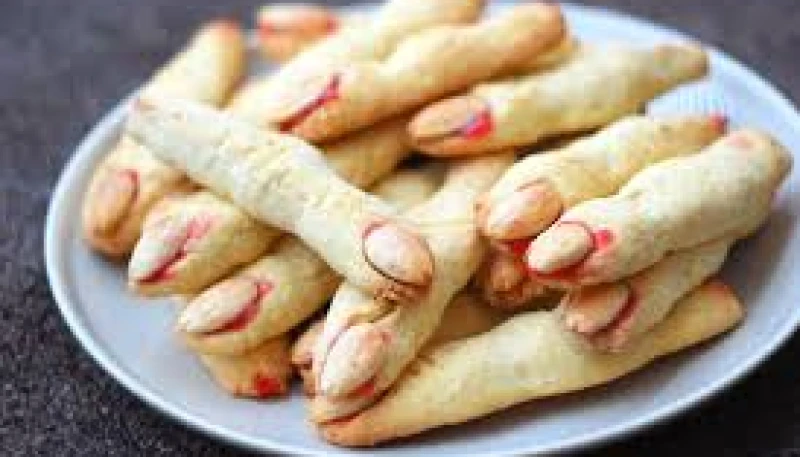 ÉTAPE 5Déposez une amande au bout de chaque doigt pour imiter l’ongle, en appuyant légèrement. Placez les doigts sur une plaque de four recouverte de papier de cuisson et enfournez pour 20 à 25 minutes.