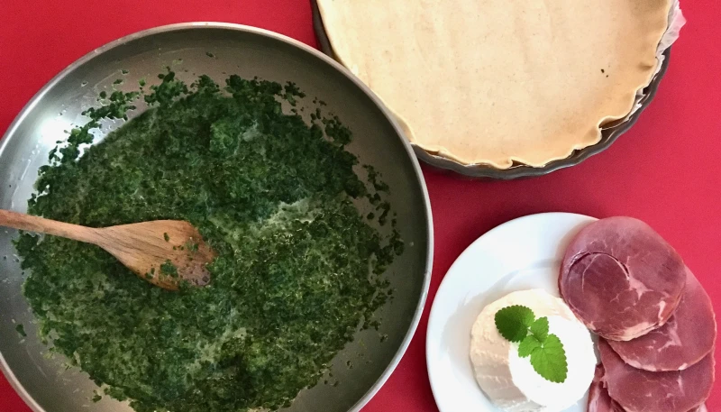 Verser la moitié des épinards sur la pâte, disposer le reste du bacon et verser le reste des épinards.