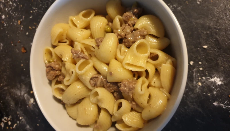 Mélanger au coquillettes et ajouter le bouillon que vous aurez réalisé avec l'eau et le cube. Laisser reposer 5 mn.