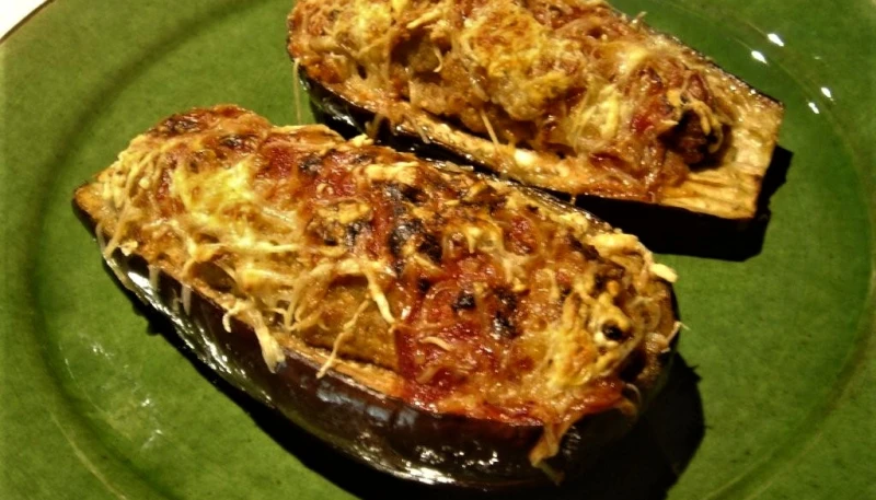 Garnir les peaux d'aubergines avec cette préparation et la recouvrir de fromage râpé.
