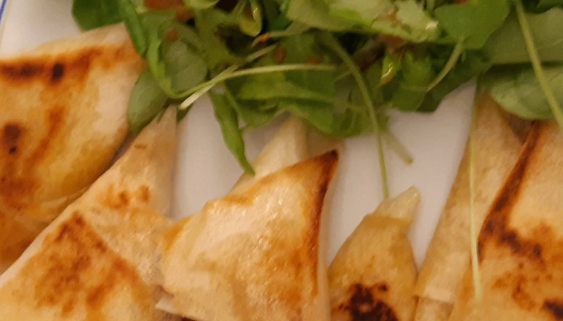 Pour les samossas de chèvre-miel, mettez sur le bord de la feuille, une tranche de chèvre, ajoutez une cuillère à café de miel et de la coriandre ou du romarin.