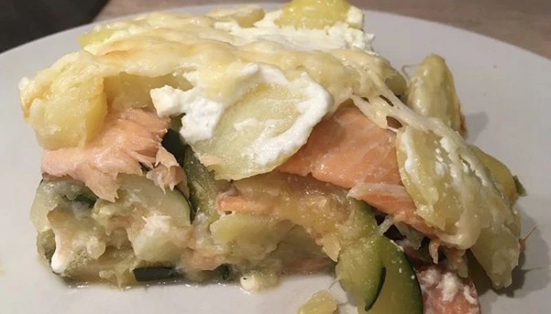 ➡️ dans un plat à gratin, alterner les couches : mettre la moitié des courgettes puis la moitié des pommes de terre puis la moitié de la crème fraîche, la moitié du saumon, le reste des courgettes, le reste du saumon, le reste des pommes de terre puis terminer par le reste de la crème fraîche. Recouvrir le tout avec le gruyère râpé. Poivre, épices ou aromates si vous souhaitez...