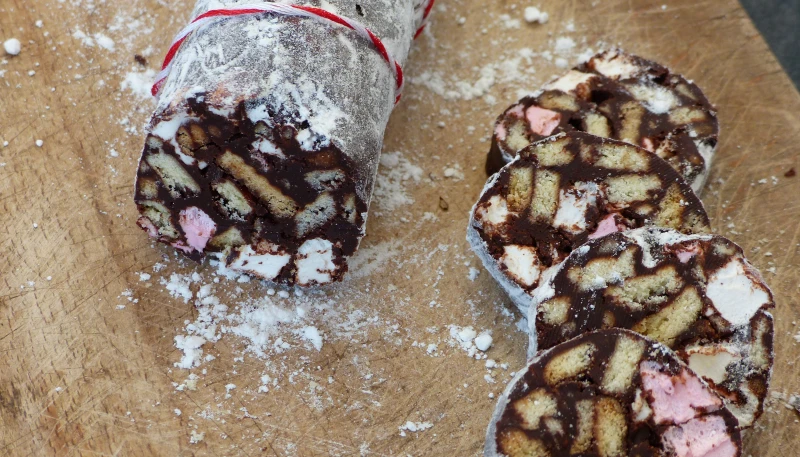 8. Le sortir du frigo juste avant dégustation et retirez le film alimentaire. Recouvrir le saucisson de sucre glace.