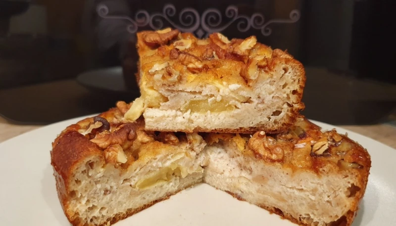 Gâteau de pain perdu aux pommes, cannelle et noix. Il me restait quelques tranches de petits pains ronds à toasts et hop... en gâteau ! C’est bon, très très moelleux, humide, fondant avec les pommes et croquant avec les noix... meilleur tiède c’est un vrai régal pour une ou deux personnes, petit déjeuner ou goûter… selon vos envies.