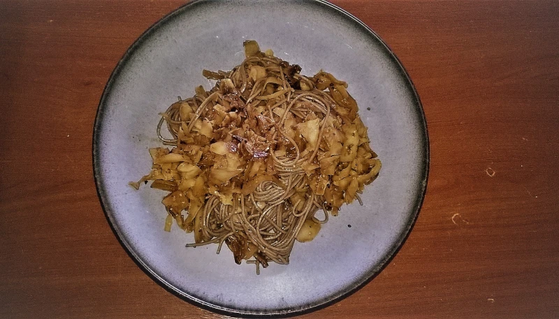 - Rajouter le chou vert émincé et le tamari et faire revenir à feu vif 2 minutes. Puis rajouter les épices et la moutarde, couvrir et laisser mijoter 10 minutes.
