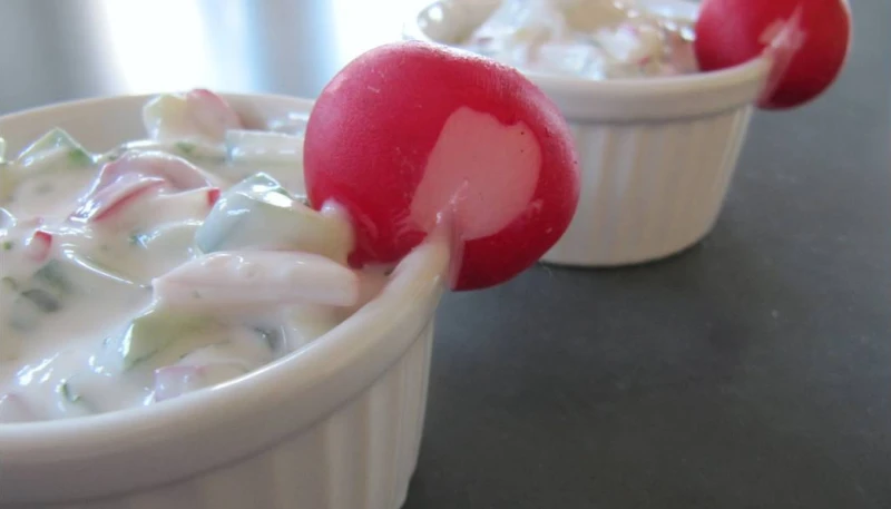 - Dans un saladier : mélanger le fromage frais, le jus de citron, les herbes ciselées, du sel et du poivre. Ajouter les rondelles de radis et mélanger.