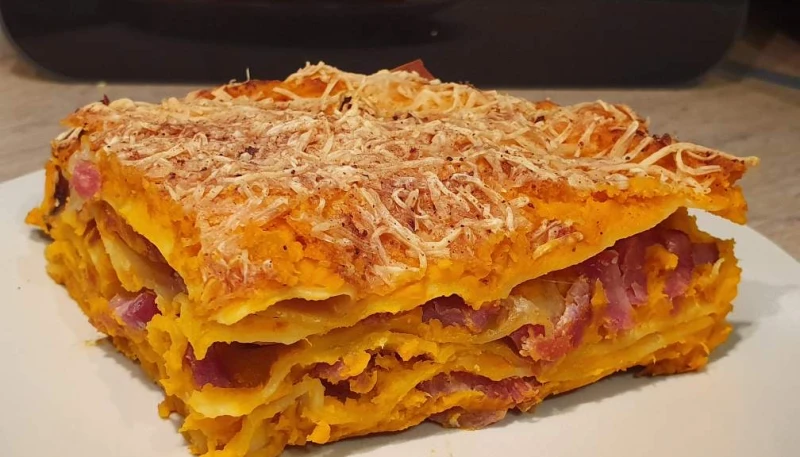 ➡️ Dans un plat à gratin, déposer une couche de purée de courge, ajouter une couche de bacon et d’oignon, une couche de lasagnes, et recommencer jusqu’à épuisement des ingrédients. Terminer par une couche de purée. Saupoudrer de gruyère râpé et de muscade et mettre à cuire au four 40/45 min à 180 degrés.