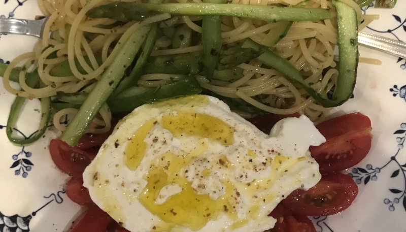 4. Egouttez les pâtes et mettez-les dans la poêle avec les asperges. Remuez et servez les pâtes à côté des tomates/burrata. Dégustez aussitôt !