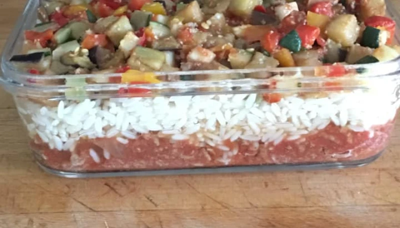 J’ai disposé la viande dans son coulis de tomates déjà assaisonné ; dessus, j’ai mis le riz et j’ai recouvert le tout de la brunoise que j’ai fait revenir avec un oignon et de l’ail pendant 10 mn. Le tout saupoudré d’emmental râpé !