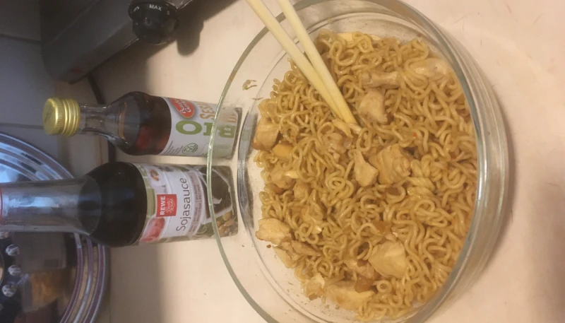 Égoutter les nouille, ajouter l'huile de sésame, 4 cuillères à café de sauce soja et mélanger. Ajouter ensuite 2 bonnes cuillères à café de saté et mélanger.