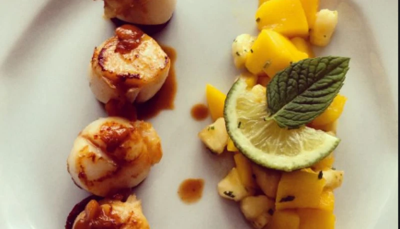 • Faire fondre le beurre dans une poêle et saisir les mangues coupées en morceaux pendant 2 minutes Ajouter les Saint-Jacques et lorsqu’elles sont dorées, ajouter le persil ciselé.