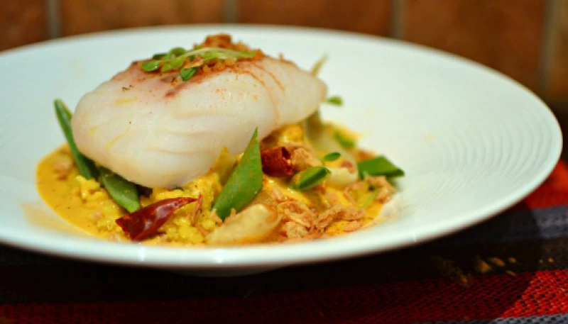 • Présenter les pavés sur le pâtes en couronnes et napper avec les légumes au curry coco.