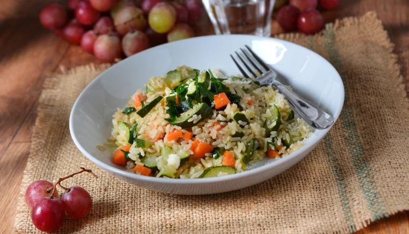 4. Incorporez dans le riz le jambon et la moitié des courgettes. Servez