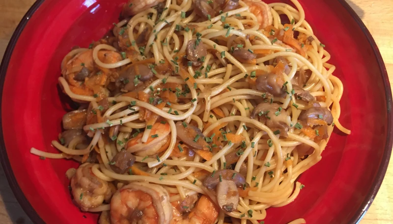 5/ Au bout de 5 mn, incorporer les carottes rapées et les spaghettis.
