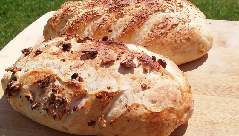 Incorporez les graines de sésame + pavot dans une première pâte, et incorporez les noix dans la seconde pâte. Donnez-leur la forme du pain que vous souhaitez. Ensuite, entaillez le dessus du pain et passez du yaourt nature à l'aide d'un pinceau , parsemez de graines et de noix.