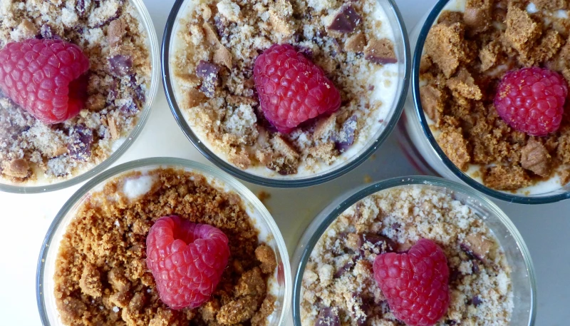 10. Pour la déco, déposez quelques miettes de biscuits sur le dessus ainsi qu’une framboise.