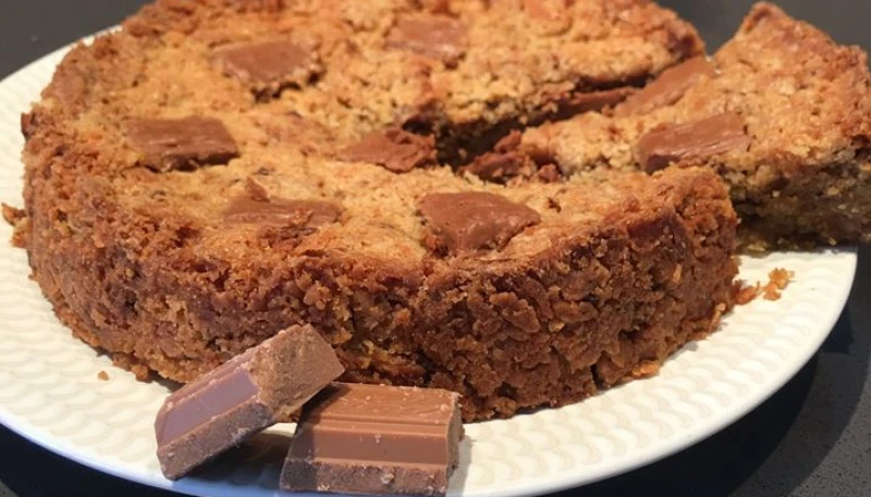 5° Mettre la pâte dans un moule beurré et fariné, aplatir la pâte, puis répartir par dessus les morceaux de chocolat restant.