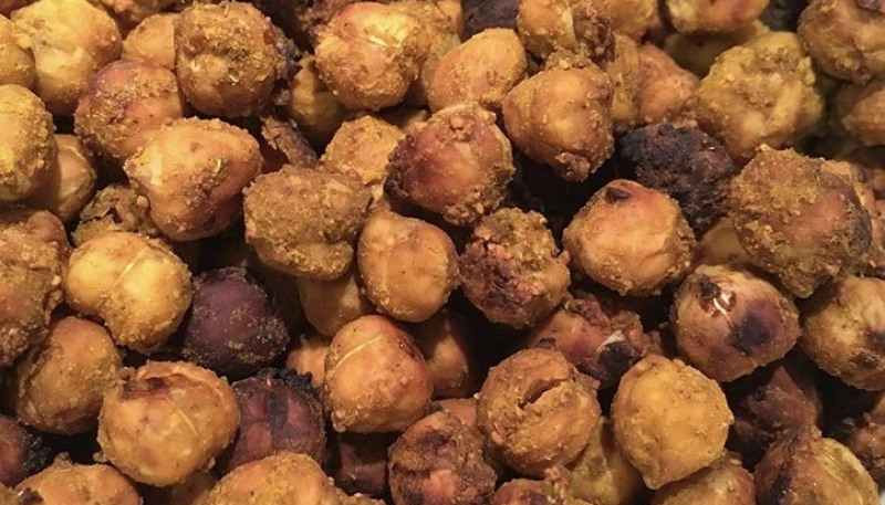 Il s’agit de pois chiches enrobés de curry, de sel et d’ail en poudre puis cuits au four jusqu’à ce qu’ils soient croquants.