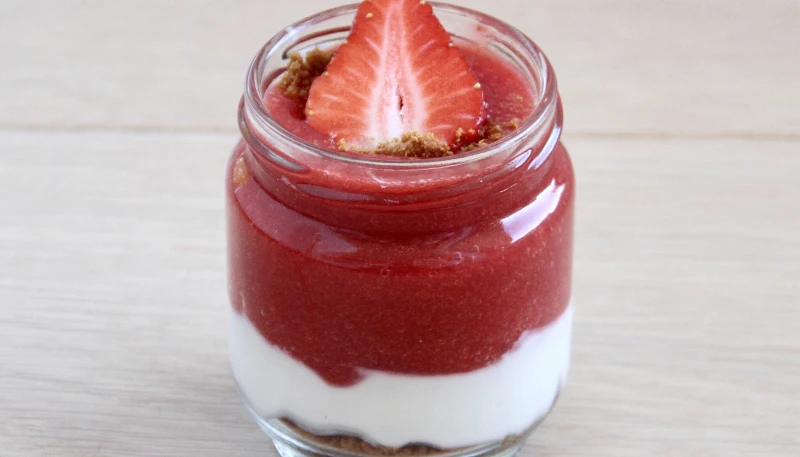 Dans 3 verrines, mettez du spéculos. Recouvrez de yaourt puis de coulis de fraises. Pour la décoration, ajoutez un peu de spéculos et une demi-fraise.