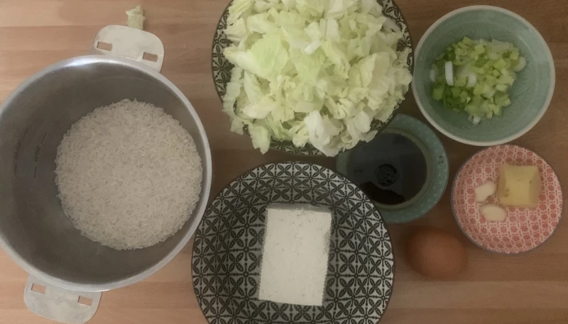 1. Lancez la cuisson du riz dans une casserole en suivant les instructions, lavez le chou chinois et l'oignon nouveau puis découpez-les finement. Réservez séparément.