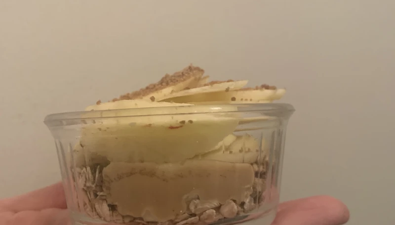 2. Déposez au fond de chaque ramequin, une cuillère à soupe de flocons d'avoine et ajoutez 2 cuillères à soupe de lait par dessus.