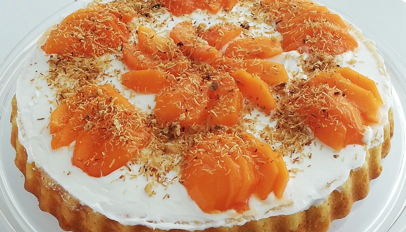 Disposez les abricots coupés,et parsemer le kadayif aux noix sur l'ensemble du gâteau.