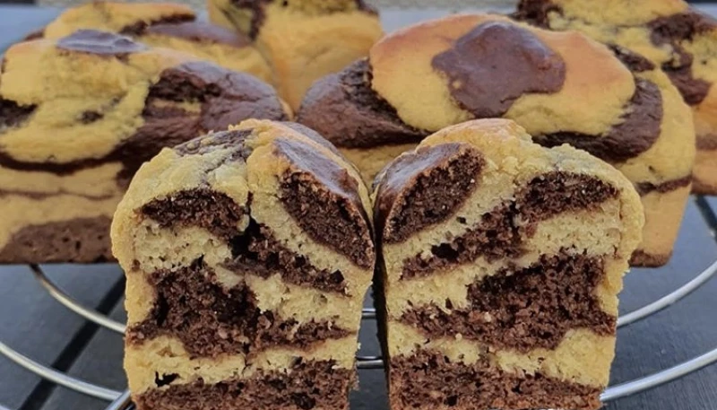 3° Verser dans des moules à mini cakes (ou autre) en alternant les couches de pâte (nature/cacao/nature/cacao) et en les remplissant aux 3/4.