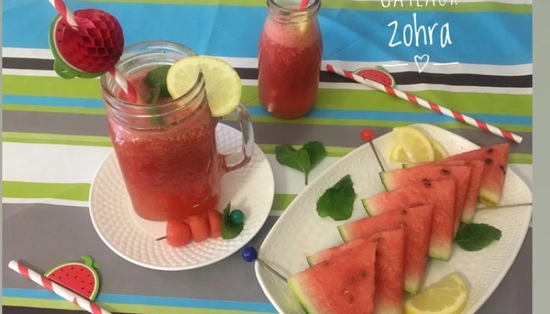 Dans un blender mettez la chair de pastèque , le sucre, la limonade , la menthe ciselée et mixez l’ensemble.