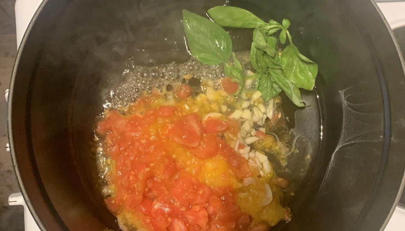 1. Prenez une grande casserole et dans 2 cuillères à soupe d'huile d'olive, faites revenir l'ail que vous aurez émincé, les tomates coupées en dés (vous pouvez les émonder si vous n'aimez pas la texture de la peau) et une dizaine de feuilles de basilic. Salez et poivrez.